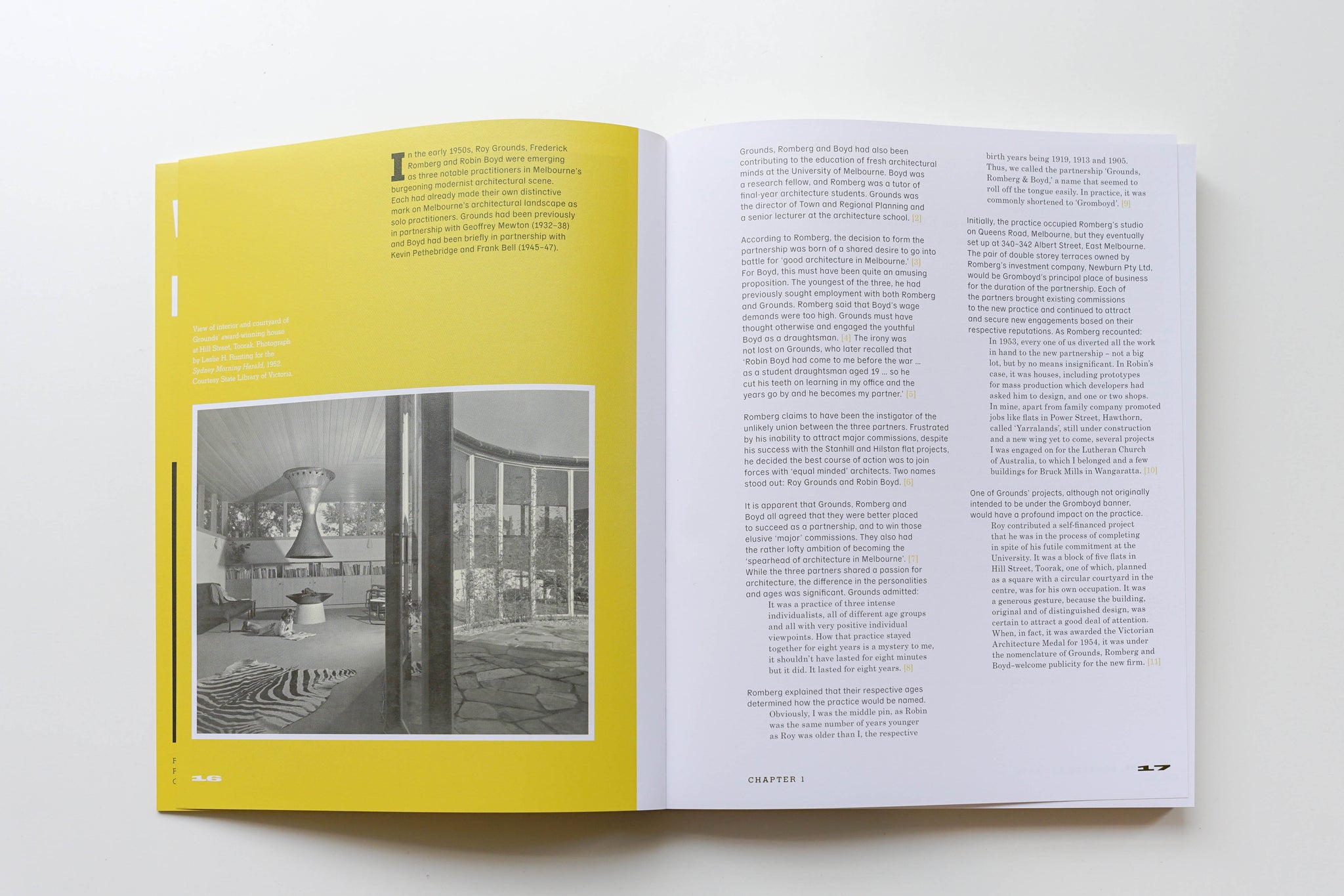 Spread from the book 'Grounds, Romberg & Boyd: Melbourne’s Midcentury Modernists' featuring a photo of Roy Grounds' Hill Street residence. ISBN 9781922601278