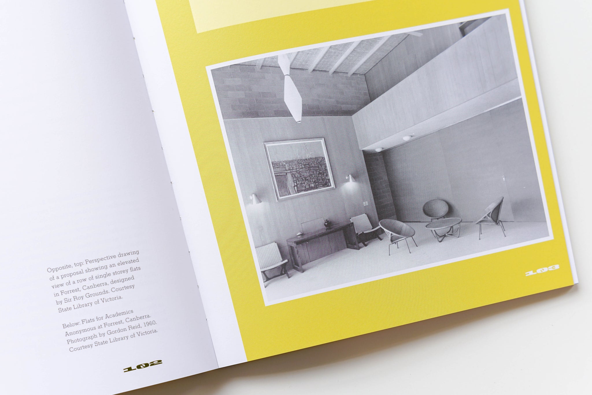 Spread from the book 'Grounds, Romberg & Boyd: Melbourne’s Midcentury Modernists' featuring  a photo of the Academics Annonymous residence in Canberra. ISBN 9781922601278