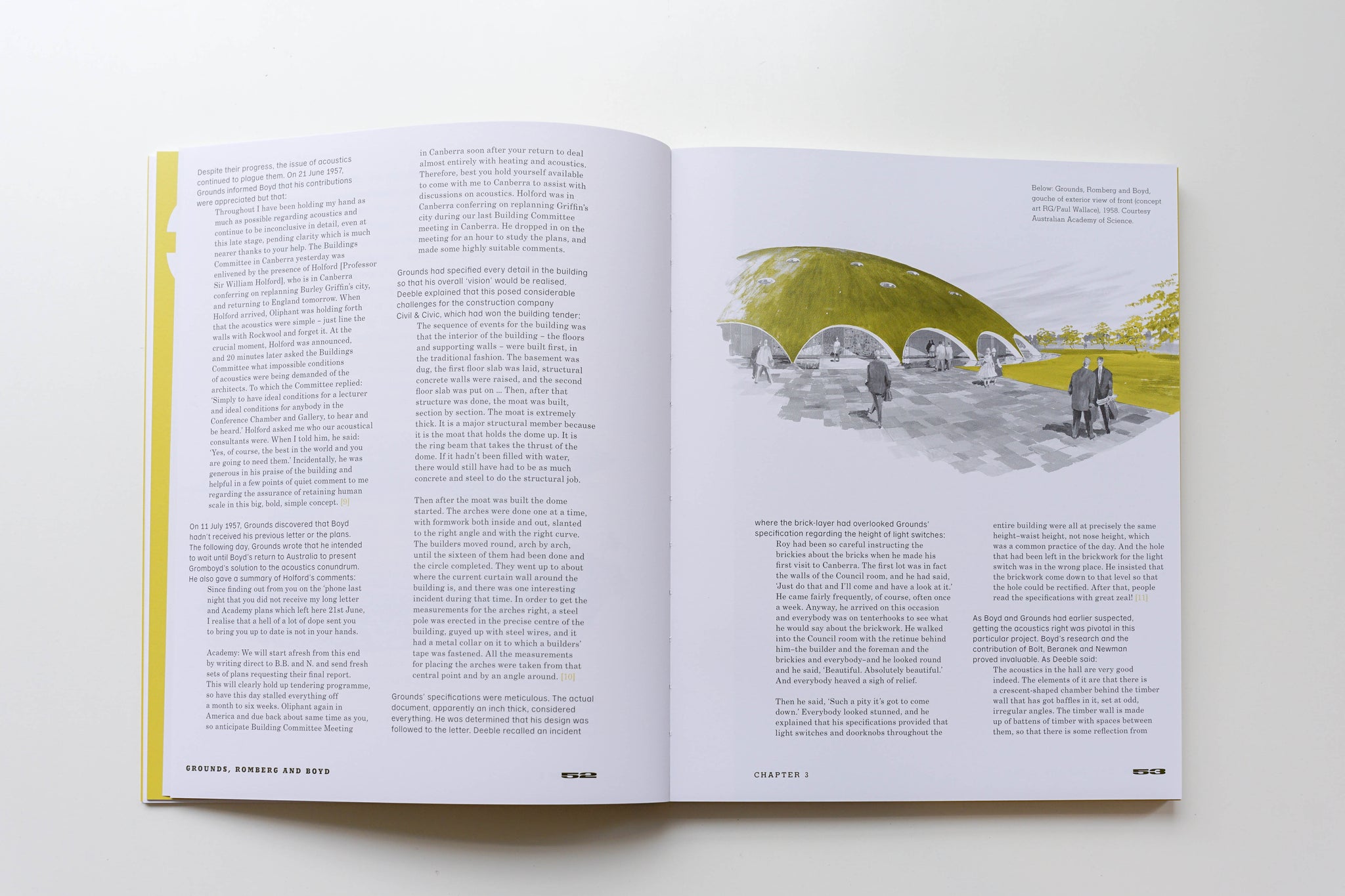 Spread from the book 'Grounds, Romberg & Boyd: Melbourne’s Midcentury Modernists' featuring a drawing of the Australian Academy of Science building. ISBN 9781922601278